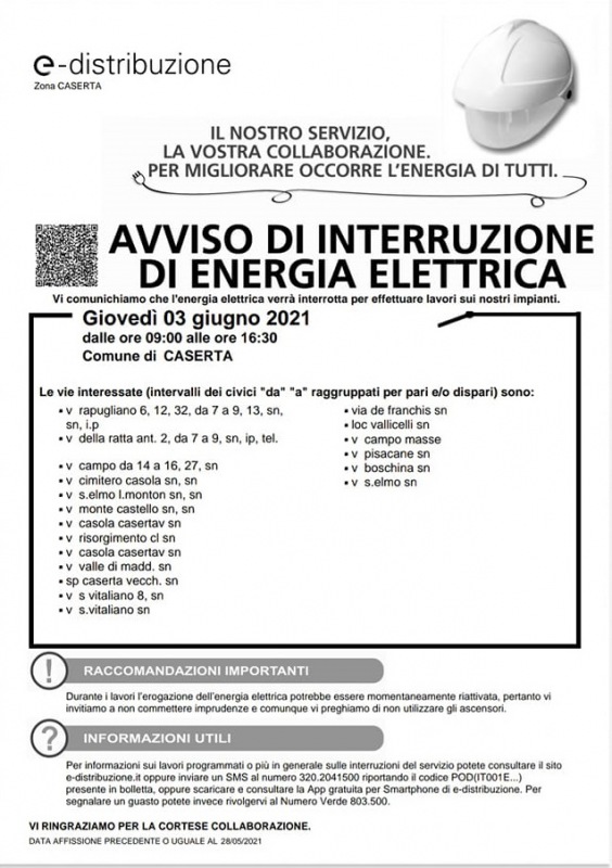 ATTENZIONE. Ce. L'energia elettrica verrà interrotta l'1 giugno, le strade interessate