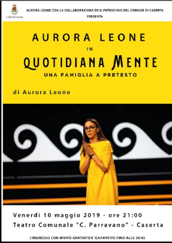 Venerdì 10 maggio, con inizio alle ore 21.00, il Teatro Comunale Parravano di via Mazzini ospiterà Aurora Leone, finalista Italia's Got Talent 2019, nello spettacolo "Quotidiana Mente - Una famiglia a pretesto", patrocinato dal Comune. L'ingresso al Teatro - si legge nel comunicato - sarà consentito fino alle ore 20.45 con invito gratuito. Gli inviti potranno essere ritirati, in un numero massimo di 4 tagliandi, dalle ore 9.00 di giovedì 2 maggio, presso l'Infopoint Turismo della Regione Campania sito in piazza Vanvitelli, negli uffici a piano terra del Palazzo del Comune. L'Infopoint Turismo della Regione Campania, che l'Amministrazione comunale ringrazia per la collaborazione, osserva i seguenti orari: ore 9.00 - ore 16.00, dal lunedì al venerdì; ore 9.00 - ore 15.00, il sabato e la domenica."
