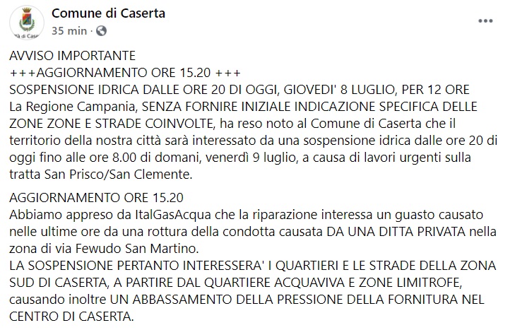 Questo quanto apprendiamo dalla pagina fb del Comune di Caserta: "AVVISO IMPORTANTE +++AGGIORNAMENTO ORE 15.20 +++ SOSPENSIONE IDRICA DALLE ORE 20 DI OGGI, GIOVEDI' 8 LUGLIO, PER 12 ORE La Regione Campania, SENZA FORNIRE INIZIALE INDICAZIONE SPECIFICA DELLE ZONE ZONE E STRADE COINVOLTE, ha reso noto al Comune di Caserta che il territorio della nostra città sarà interessato da una sospensione idrica dalle ore 20 di oggi fino alle ore 8.00 di domani, venerdì 9 luglio, a causa di lavori urgenti sulla tratta San Prisco/San Clemente. AGGIORNAMENTO ORE 15.20 Abbiamo appreso da ItalGasAcqua che la riparazione interessa un guasto causato nelle ultime ore da una rottura della condotta causata DA UNA DITTA PRIVATA nella zona di via Fewudo San Martino. LA SOSPENSIONE PERTANTO INTERESSERA' I QUARTIERI E LE STRADE DELLA ZONA SUD DI CASERTA, A PARTIRE DAL QUARTIERE ACQUAVIVA E ZONE LIMITROFE, causando inoltre UN ABBASSAMENTO DELLA PRESSIONE DELLA FORNITURA NEL CENTRO DI CASERTA."