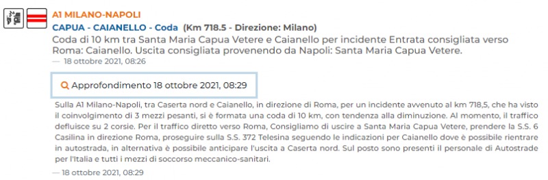 Sulla A1 Milano-Napoli, tra Caserta nord e Caianello, in direzione di Roma, per un incidente avvenuto al km 718,5 - si legge - che ha visto il coinvolgimento di 3 mezzi pesanti, si è formata una coda di 11 km, con tendenza all'aumento. Al momento, il traffico defluisce su 2 corsie. Per il traffico diretto verso Roma, Consigliamo di uscire a Santa Maria Capua Vetere, prendere la S.S. 6 Casilina in direzione Roma, proseguire sulla S.S. 372 Telesina seguendo le indicazioni per Caianello - prosegue la nota - dove è possibile rientrare in autostrada, in alternativa è possibile anticipare l'uscita a Caserta nord. Sul posto sono presenti il personale di Autostrade per l'Italia e tutti i mezzi di soccorso meccanico-sanitari".
