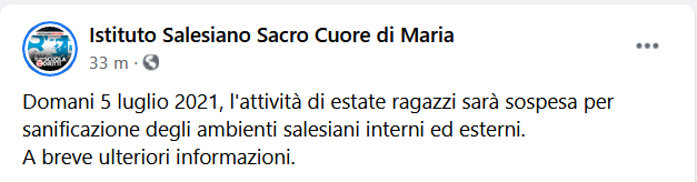 Questo il post pubblicato sulla pagina Facebook dell'Istituto Salesiano Sacro Cuore di Maria: "Domani 5 luglio 2021 - si legge nel post - l'attività di estate ragazzi sarà sospesa per sanificazione degli ambienti salesiani interni ed esterni. A breve ulteriori informazioni".