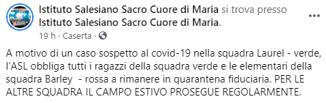 Questo il post pubblicato sulla pagina Facebook dell''Istituto Salesiano Sacro Cuore di Maria' di Caserta: "A motivo di un caso sospetto al covid-19 nella squadra Laurel - verde, l'ASL - si legge nel post - obbliga tutti i ragazzi della squadra verde e le elementari della squadra Barley - rossa a rimanere in quarantena fiduciaria. Per le altre squadre il campo estivo prosegue regolarmente".