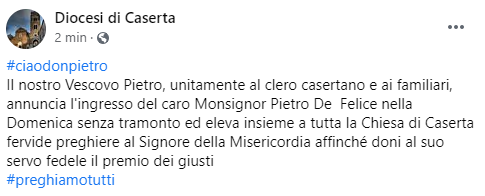 Questo il post pubblicato sulla pagina Facebook 'Diocesi di Caserta': "Ciao Don Pietro. Il nostro Vescovo Pietro, unitamente al clero casertano e ai familiari, annuncia l'ingresso del caro Monsignor Pietro De Felice nella Domenica senza tramonto - prosegue il post - ed eleva insieme a tutta la Chiesa di Caserta fervide preghiere al Signore della Misericordia affinché doni al suo servo fedele il premio dei giusti. Preghiamo tutti".