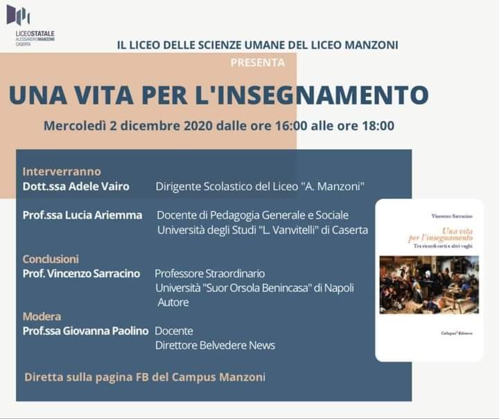 Mercoledì prossimo dalle 16 alle 18 il Liceo delle scienze umane dell'Istituto Manzoni presenterà, via remoto, 'Una vita per l'insegnamento' di Vincenzo Sarracino. All'evento interverranno Adele Vairo, Dirigente scolastico del Liceo Manzoni, la professoressa Lucia Auriemma, docente di pedagogia generale e sociale dell'Università degli Studi 'L.Vanvitelli' e l'autore di 'Una vita per l'insegnamento' Vicenzo Sarracino, professore Straordinario alla 'Suor Orsola Benincasa'. Moderatrice dell'evento la professoressa Giovanna Paolino. La presentazione avverrà solo in diretta Facebook (non in presenza) sulla pagina del Campus Manzoni per le leggi relative al Covid 19.