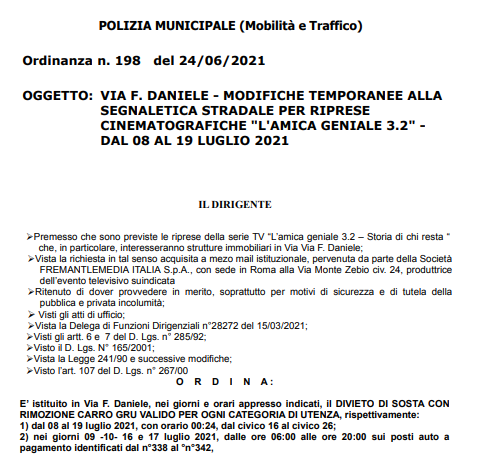 Lo apprendiamo dal sito web del Comune di Caserta. Dal 2 luglio in pieno centro il cast di 'L'amica geniale' sarà impegnato nelle riprese della serie 3.2. Saranno tanti gli attori famosi che frequenteranno le strade del centro storico: tra loro spiccano le protagoniste Gaia Girace 'Lila' e Margherita Mazzucco 'Elena'. Per l'occasione il Comune ha variato la segnaletica stradale in via Daniele. Questo il dispositivo dell'Ordinanza:
