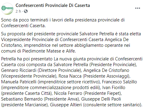 Questo il post pubblicato sulla pagina Facebook 'Confesercenti provinciale Caserta': "Sono da poco terminati i lavori della presidenza provinciale di Confesercenti Caserta. Su proposta del presidente provinciale Salvatore Petrella è stata eletta Vicepresidente Provinciale di Confesercenti Caserta Angelica De Cristofano - si legge nel post - imprenditrice nel settore abbigliamento operante nei comuni di Piedimonte Matese e Alife. Petrella ha poi presentato La nuova giunta provinciale di Confesercenti Caserta cosi composta da Salvatore Petrella (Presidente Provinciale), Gennaro Ricciardi (Direttore Provinciale), Angelica De Cristofano (Vicepresidente Provinciale), Rosa Nacca (Presidente Assoviaggi), Manuela Patricelli (imprenditrice settore ricettivo), Francesco Salzillo (imprenditore commercializzazione prodotti edili), Ivan Fiorillo (presidente Caserta Città), Nicola Ferraro - prosegue il post - (Presidente Fiepet), Sebastiano Bernardo (Presidente Anva), Giuseppe Delli Paoli (presidente Marcianise), Giuseppe Altieri (consulente settore sanitario)".