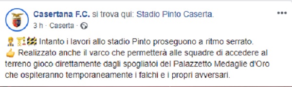 Questo il post pubblicato sulla pagina fb ufficiale della Caserta F.C.
