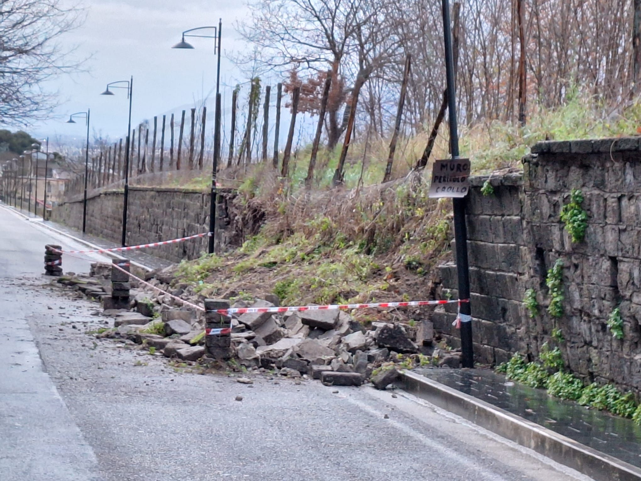 Il crollo di una grossa porzione di un muro di recinzione si è verificato a Caserta, tra San Leucio e la frazione Vaccheria. Pietre e terriccio si sono riversate sulla carreggiata. Per fortuna, al momento del crollo, non c'erano vetture in transito. Parte della strada, però, è occupata dai detriti e quindi su quel tratto, è necessario guidare con particolare prudenza.