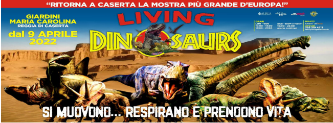 Questo il comunicato stampa diffuso dall'organizzazione di 'Living Dinosaurs': "Arriva a Caserta, da sabato 9 aprile, la mostra più grande d'Europa “Living Dinosaurs”. Un incredibile viaggio nel tempo alla scoperta dei giganti della terra estinti ormai milioni di anni fa. Una emozionante e fantastica escursione tutta da vivere nei Giardini Maria Carolina - si legge nel comunicato - alla Reggia di Caserta. Per tutta la famiglia fino al prossimo 26 giugno, con la produzione della Aurea Exhibitions” e l'organizzazione della Alta Classe Lab, Next Event e We Share, tanti dinosauri che respirano e si muovono come se fossero vivi. Ogni dinosauro presenta movimenti, colori e suoni realistici, offrendo al visitatore incontri unici di ”vita quotidiana” con queste enormi creature. Il team di esperti - prosegue il comunicato - ha lavorato alla creazione di ogni singolo dinosauro considerando i minimi dettagli. Display illustrati e pannelli informativi spiegano la storia dei dominatori della terra di milioni di anni fa con un linguaggio semplice, di facile comprensione ed apprendimento per tutti. Per i visitatori la mostra dei record si tramuta in una passeggiata indimenticabile tra i diversi habitat di ogni dinosauro. Con l'aggiunta di diverse aree didattiche e, a richiesta, l'utilizzo di moderni visori 3D - si legge ancora - tutti potranno provare un'esperienza emozionante, apprezzando la maestosità in movimento di questi incredibili animali scomparsi, come se fossero stati conservati e protetti alla pari di quelli del celebre film “Jurassic Park”. Faccia a faccia con il cattivissimo Tyrannosaurus Rex, con l’erbivoro Triceratops, con il maestoso Brachiosaurus: dinosauri volanti e che camminano verso di voi, pronti ad essere osservati e fotografati…l’effetto “Wow” è assicurato! Uno spasso per i bambini e un'occasione unica anche per gli adulti, per imparare e divertirsi, scoprendo tutti i segreti dei giganti del passato, dalla loro prima apparizione sulla Terra alla loro misteriosa estinzione. Gli orari di apertura - prosegue il comunicato - della mostra sono dal lunedì al venerdì dalle 10 alle 13 e dalle 15 alle 20, mentre il sabato, la domenica e i festivi dalle 10 alle 22 con orario continuato. Biglietti d'ingresso presso ticketone e ciaotickets".