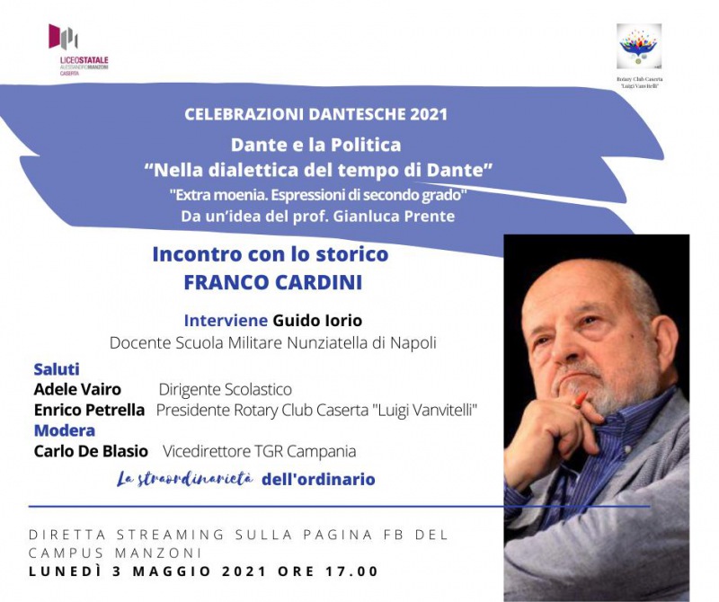 Questo il comunicato stampa diffuso dal Liceo Manzoni: "'Dante e la politica': lo storico Franco Cardini incontra i manzoniani. Sarà Franco Cardini l’ospite d’onore del prossimo incontro del ciclo di incontri organizzato dal Liceo Manzoni in occasione dei 700 anni dalla morte di Dante Alighieri. Stimato storico e saggista italiano, lunedì alle ore 17 Cardini sarà in diretta sulla pagina Campus Manzoni per l’importante appuntamento di «Extra moenia. Espressioni di secondo grado», l’innovativo - si legge nel comunicato - e vincente format tutto manzoniano voluto per celebrare Dante. Quello di lunedì - prosegue il comunicato - sarà un incontro connotato da un forte focus storico sulla figura e sul pensiero dantesco, intitolato "Dante e la politica". Ad accompagnare Cardini nella sua esposizione, ci sarà anche Guido Iorio, docente - si legge ancora nel comunicato - presso la Scuola Militare “Nunziatella” di Napoli oltre che penna di centinaia di articoli, saggi e monografie storiche. A moderare il dibattito Carlo Di Blasio, vicedirettore Tgr Campania. «La partecipazione di Cardini al nostro cartellone dantesco– ha commentato Adele Vairo, Dirigente Scolastico del liceo Manzoni - dimostra che l’enorme lavoro fatto in questi ultimi mesi per organizzare - si legge nel comunicato - i tanti eventi in memoria di Dante Alighieri è stato più che apprezzato. Sono particolarmente grata a tutti gli ospiti che si sono susseguiti nei tanti appuntamenti calendarizzati e che hanno saputo impreziosire il dibattito con interventi di qualità e di alto spessore». Nate a febbraio come format interno del liceo, infatti, le celebrazioni - si legge nel comunicato - dantesche del liceo Manzoni hanno ben presto raccolto l’entusiasmo dei tanti cittadini casertani ed oltre che, apprezzando il valore dell’iniziativa, hanno iniziato a seguire gli incontri partecipando in prima persona attraverso le piattaforme streaming. Un format originale - prosegue il comunicato - quello ideato da Gianluca Parente, docente di italiano e latino del liceo Manzoni, e convintamente sostenuto dalla Dirigente del liceo Adele Vairo, e dal Rotary Club Caserta Luigi Vanvitelli presieduto da Enrico Petrella, e che è riuscito concretamente a calare nella realtà culturale casertana le attività curriculari ed extracurricolari del prestigioso liceo casertano, comunemente detto il Campus. Un occhio al territorio - conclude il comunicato - quindi, tenendo ben presente il ruolo principale e da protagonisti degli studenti".