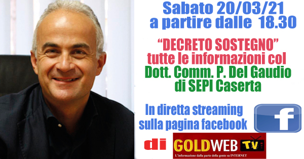 Il 'Decreto Sostegno' approvato ieri dal Governo Draghi, sarà illustrato nei suoi contenuti salienti dal dott. Pio Del Gaudio, commercialista di Sepi Caserta, nella diretta Facebook sui canali di GoldwebTv a partire dalle 18.30. Tanti gli argomenti da approfondire: dalle misure di sostegno verso imprese e cittadini ai requisiti per accedervi. Notizie utili in vista del mese di Aprile durante il quale sono attesi i primi versamenti di contributi da parte dello Stato.
