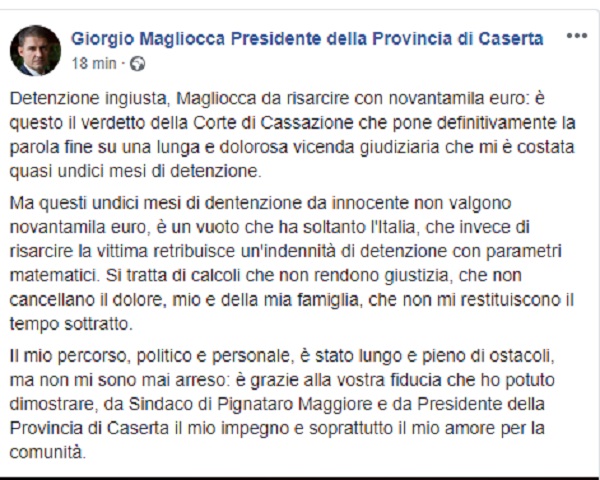 Questo il post pubblicato sulla pagina fb ufficiale del Presidente della Provincia di Caserta Giorgio Magliocca.