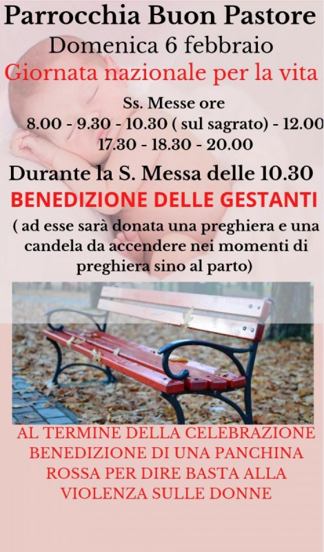 Domani alla Parrocchia del Buon Pastore di Caserta è in programma la celebrazione della Giornata nazionale della Vita. Diversi gli appuntamenti: alle 10.30 ci sarà la benedizione delle gestanti. Poi anche la benedizione di una panchina rossa, per dire no alla violenza sulle donne.