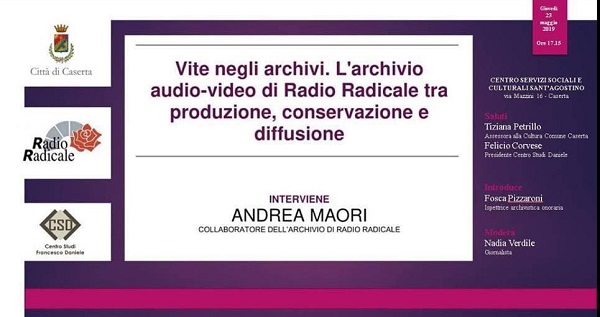 "Domani 23 Maggio alle ore 17.15 la Sala Convegni del Centro Culturale Sant'Agostino, in via Mazzini 16, ospiterà, con una conversazione di Andrea Maori, la Storia dell'Archivio di Radio Radicale per ripercorrerne le vicende, l'importanza e il valore. L'archivio Audo Visivo di Radio Radicale è sicuramente una delle fonti della memoria storica contemporanea del nostro Paese, un servizio pubblico. Il Comune di Caserta si è impegnato, attraverso una delibera di Consiglio Comunale approvata all'unanimità, a fare propria la battaglia di Radio Radicale, baluardo della democrazia italiana e del diritto all'informazione."