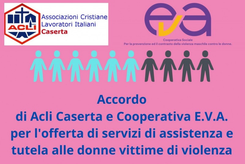 Questo il comunicato stampa diffuso dalla cooperativa E.V.A. Onlus: "La cooperativa E.V.A. persegue il contrasto di qualsiasi forma di violenza e negazione dei diritti nei confronti delle donne e dei minori. Le Acli di Caserta promuovono, tra i diversi servizi, le attività di assistenza previdenziale e fiscale con i propri uffici di Patronato e Caf. La cooperativa E.V.A. e le ACLI di Caserta - si legge nel comunicato - hanno sottoscritto un protocollo di intesa per sostenere le attività formative ed informative di contrasto alle molestie e per favorire la consulenza ed il patrocinio alle donne che si rivolgono alla cooperativa E.V.A. Le Acli di Caserta si impegnano a rendere disponile presso i propri uffici materiale informativo della Cooperativa E.V.A. inerente ai servizi di prevenzione e contrasto della violenza maschile contro le donne; a rendere noto agli utenti degli Sportelli - prosegue il comunicato - delle Acli di Caserta che le donne che intendessero avere un primo colloquio con il personale qualificato della Cooperativa E.V.A. potranno ricevere una visita, previo appuntamento, presso gli stessi locali delle Acli di Caserta, in un ambiente riservato e adatto al colloquio; a collaborare per dare concreta assistenza - prosegue ancora il comunicato - alle donne che hanno necessità di accedere ai diritti ed alle misure pubbliche di sostegno previdenziale, fiscale ed assistenziale previste dalle norme statali, regionali e comunali; facilitare la presa in carico da parte dei propri Uffici di Caf e Patronato Acli delle persone segnalate dalla Cooperativa E.V.A. Onlus, fornendo loro una pronta e dedicata assistenza per l’accesso ai diritti ed alle prestazioni assistenziali. La Cooperativa E.V.A. Onlus - conclude il comunicato - ha, dunque, facoltà di avviare le donne sostenute ai Caf e Patronati Acli della Provincia di Caserta, per esservi prontamente accolte e assistite".