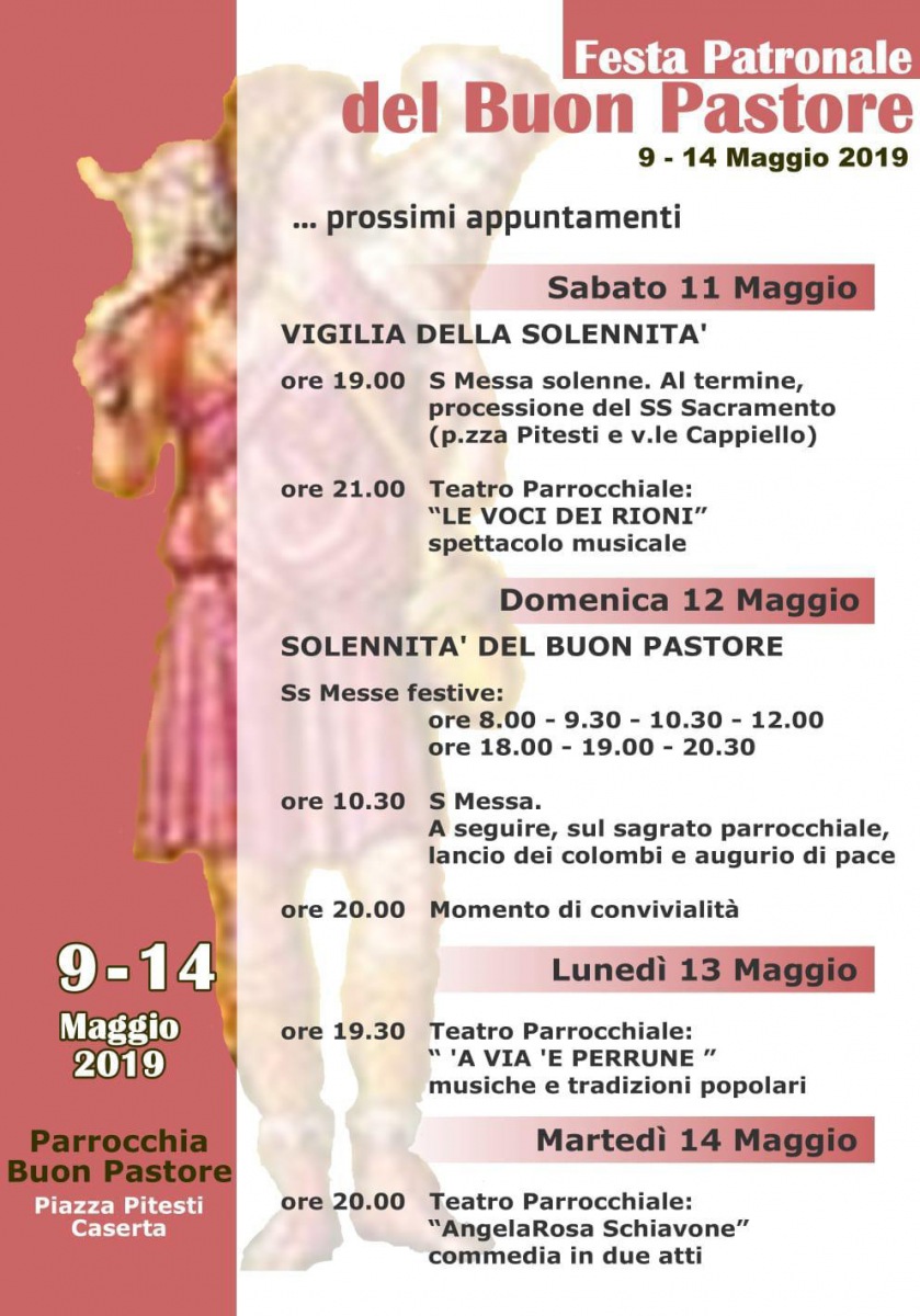 Pubblichiamo la locandina inerente alla Festa Patronale del Buon Pastore che si terrà nella Parrocchia Buon Pastore di Piazza Pitesti a Caserta dal 9 al 14 maggio 2019. L'evento sarà caratterizzato da messe solenni, spettacoli teatrali e musicali e momenti di convivialità.