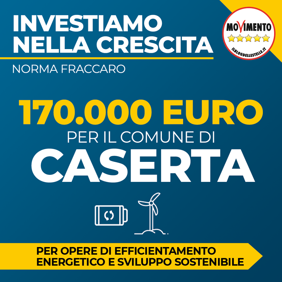 "Anche per il comune di Caserta, in base al numero di abitanti, vengono stanziati 170 mila euro per avviare opere pubbliche in materia di efficientamento energetico e di sviluppo sostenibile. Con una norma inserita nel decreto Crescita, voluta dal Ministro Riccardo Fraccaro, il governo ha stanziato altri 500 milioni di euro a favore dei Comuni di tutta Italia. Le risorse finanzieranno opere per promuovere il risparmio energetico negli edifici pubblici e per consentire l’installazione di impianti per la produzione di energia da fonti rinnovabili, messa in sicurezza degli edifici pubblici, mobilita’ sostenibile e per l’abbattimento delle barriere architettoniche."