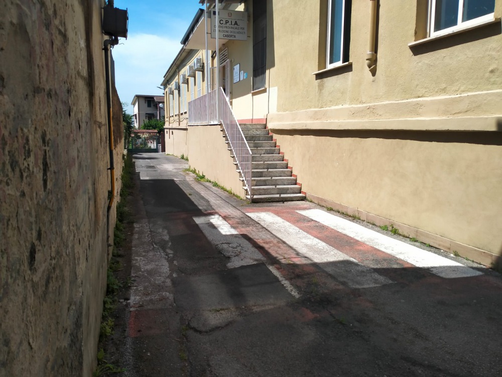 Circa tre metri di larghezza, dalla scala che da accesso ad un pubblico edificio al muro che le sta di fronte. Per garantire un attraversamento pedonale proprio sicuro dalla scala al muro e viceversa sono state dipinte delle strisce pedonali quanto meno singolari. Accade a Caserta, nella frazione di San Clemente, in una piccola traversa molto poco trafficata. Ed anche le immagini di questa 'anomala' segnaletica orizzontale, dopo quella ora rimossa della pista ciclabile in zona biblioteca, stanno facendo il giro dei social e suscitando commenti diveriti tra gli utenti.