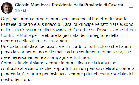 Questo il post pubblicato dal Presidente della Provincia Giorgio Magliocca sulla sua pagina Facebook: "Oggi, nel primo giorno di primavera, insieme al Prefetto di Caserta Raffaele Ruberto e al sindaco di Casal di Principe Renato Natale, sono nella Sala Consiliare della Provincia di Caserta con l'associazione Libera Contro le Mafie per celebrare la giornata dell'impegno e della memoria delle vittime della camorra. Una data simbolica - si legge nel post - per associare il ricordo di tutti coloro che hanno perso la vita per mano delle mafie ad un sentimento di rinascita, che deve necessariamente accompagnare tutti noi. Come Istituzioni siamo sempre in prima linea nella lotta e nel contrasto alla camorra che, soprattutto in un periodo delicato come la pandemia - conclude il post - fa di tutto per insinuarsi sempre più nel tessuto sociale del nostro territorio".