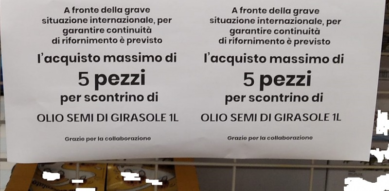 "A fronte della grave situazione internazionale, per garantire la continuità di rifornimento è previsto l'acquisto di massimo cinque pezzi per scontrino". E' l'avviso apparso in un supermercato casertano stamane (in foto). La limitazione riguarda l'olio di semi di girasole ma anche altre merci come la farina e l'olio di mais. Sono beni la cui produzione dipende dall'importazione di materie prime che provengono in buona parte dall'Ucraina e che quindi potrebbero diventare più difficilmente reperibili nei prossimi giorni. Una delle conseguenze della guerra che si sta combattendo ormai da settimane. C'è preoccupazione anche per il caro benzina ed il conseguente stato di agitazione degli autotrasportatori (da poco bloccato dalla Commissione di garanzia per lo sciopero). Oggi in alcuni supermercati si è assistito alle corsa alle scorte: vuoti i bancali soprattutto di alcuni beni di prima necessità come farina, uova e zucchero.