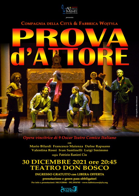 Questo il comunicato stampa diffuso da 'Compagnia della Città': "Giovedì 30 dicembre alle ore 20:45 presso il Teatro Don Bosco dei Salesiani di Caserta si rivivranno le essenze storiche del vero Teatro Comico Napoletano. L’intento della serata è ricreare le atmosfere di una tradizione facendo riassaporare un gusto ormai dimenticato del vero Teatro. Satira sottile - si legge nel comunicato - sul “sistema” del mondo dell’Arte e sullo “stato del Teatro”, parte dalla base della “commedia”, l’equivoco, l’origine della comicità. Due atti continui pensati per riuscire a coinvolgere un pubblico eterogeneo, adulti e bambini, giovani ed anziani, in continuità con le rappresentazioni che hanno fatto la storia dell’umorismo. Fabbrica Wojtyla & Compagnia della Città, portano in scena - prosegue il comunicato - “Prova d’attore”, la pluripremiata commedia comica vincitrice di ben 9 premi agli oscar del teatro comico. “Prova d’attore” è il più sincero omaggio a quella sana comicità che da Scarpetta si trasformò con l’influenza di Pirandello - recita ancora il comunicato - nella riflessione ironica di Eduardo e nel sarcasmo sociale con Luca De Filippo al quale l’opera è stata dedicata. Si narrano le esilaranti vicende di due balordi ingaggiati da un nevrotico assistente e suggeritore che provano con uno “stonato” vecchio attore d’altri tempi un testo classico rivisitato da un improbabile grande drammaturgo sotto gli occhi di una affascinante critica con la complicità - prosegue il comunicato - di una governante tedesca. L’equivoco verbale regna sovrano in tutta l’opera, una vera e propria “clownerie” del tutto originale, generando una miriade di situazioni estremamente divertenti. Ivan Santinelli, Luigi Smimmo, Mario Bilardi, Francesco Maienza, Valentina Rossi, Dafne Rapuano, sono i potenti, convincenti ed affermati attori necessari - recita ancora il comunicato - per personaggi così forti che portano a termine il loro compito con risultati assolutamente “catastrofici” fino al colpo di scena finale: lo sconcertante giudizio sull’assurda messinscena. Una commedia esilarante per portare il pubblico a condividere la amara riflessione finale che suggerisce come guardare il mondo in modo diverso - conclude il comunicato - perché come sostiene l’autore Patrizio Ranieri Ciu: “ridere è il primo gesto di sopravvivenza dell’intelligenza dell’essere umano".