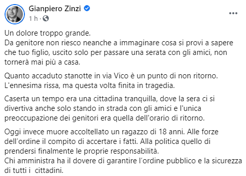 Caserta un tempo era una cittadina tranquilla, dove la sera ci si divertiva anche solo stando in strada con gli amici e l'unica preoccupazione dei genitori era quella dell'orario di ritorno. Oggi invece - si legge ancora - muore accoltellato un ragazzo di 18 anni. Alle forze dell’ordine il compito di accertare i fatti. Alla politica quello di prendersi finalmente le proprie responsabilità. Chi amministra ha il dovere di garantire l’ordine pubblico e la sicurezza di tutti i cittadini".