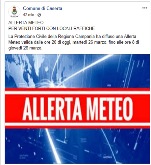Questo il post pubblicato sulla pagina fb ufficiale del Comune di Caserta.