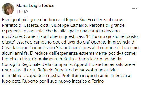 Questo il post pubblicato sulla sua pagina Facebook dal Consigliere regionale in quota Noi Campani: "Rivolgo il piu' grosso in bocca al lupo a Sua Eccellenza il nuovo Prefetto di Caserta, dott. Giuseppe Castaldo. Persona di grande esperienza e capacita' che ha alle spalle una carriera davvero invidiabile. Come si suol dire in questi casi: 'E' l'uomo giusto nel posto giusto' essendo - si legge nel post - campano doc ed avendo gia' operato in provincia di Caserta come Commissario Straordinario presso il comune di Lusciano alcuni anni fa. E' reduce dall'esperienza estremamente positiva come Prefetto a Pisa. Complimenti Prefetto e buon lavoro anche dal Consiglio Regionale della Campania. Approfitto anche per salutare e ringraziare il dott. Raffaele Ruberto che ha svolto un'attivita' incredibile - conclude il post - a capo della nostra Prefettura in questi anni. In bocca al lupo dott. Ruberto per il suo nuovo incarico a Torino".