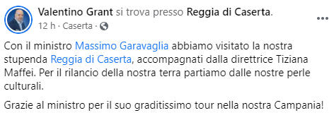 Questo il post pubblicato dall'Europarlamentare della Lega Valentino Grant sulla sua pagina Facebook: "Con il ministro Massimo Garavaglia abbiamo visitato la nostra stupenda Reggia di Caserta, accompagnati - si legge nel post - dalla direttrice Tiziana Maffei. Per il rilancio della nostra terra partiamo dalle nostre perle culturali. Grazie al ministro - conclude il post - per il suo graditissimo tour nella nostra Campania"!
