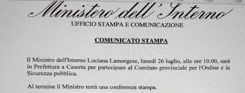 Il Ministro dell'Interno Luciana Lamorgese è arrivata a Caserta intorno alle 9.45. Presso la Prefettura parteciperà stamane al Comitato provinciale per l'ordine e la sicurezza pubblica. Dopo, il Ministro terrà una conferenza stampa che trasmetteremo sui nostri canali. Questo parte del comunicato diffuso dal Ministero.