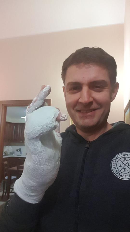 "E così ho concluso la mia settimana, poteva andar peggio, ma alla fine non mi lamento nonostante un po' di dolore. Ringrazio i medici del Pronto Soccorso dell'Azienda Ospedaliera Di Caserta Sant'anna E Sebastiano per le cure. Durante le tre ore di permanenza nella saletta dell'ospedale ho avuto modo di vedere e apprezzare l'umanità e la disponibilità dei medici e degli infermieri nei confronti dei numerosi cittadini che si sono rivolti al pronto soccorso per diversi motivi. Da domani, però, si torna al lavoro! Anche se per 40 giorni mi mancherà la palestra con i pesi."