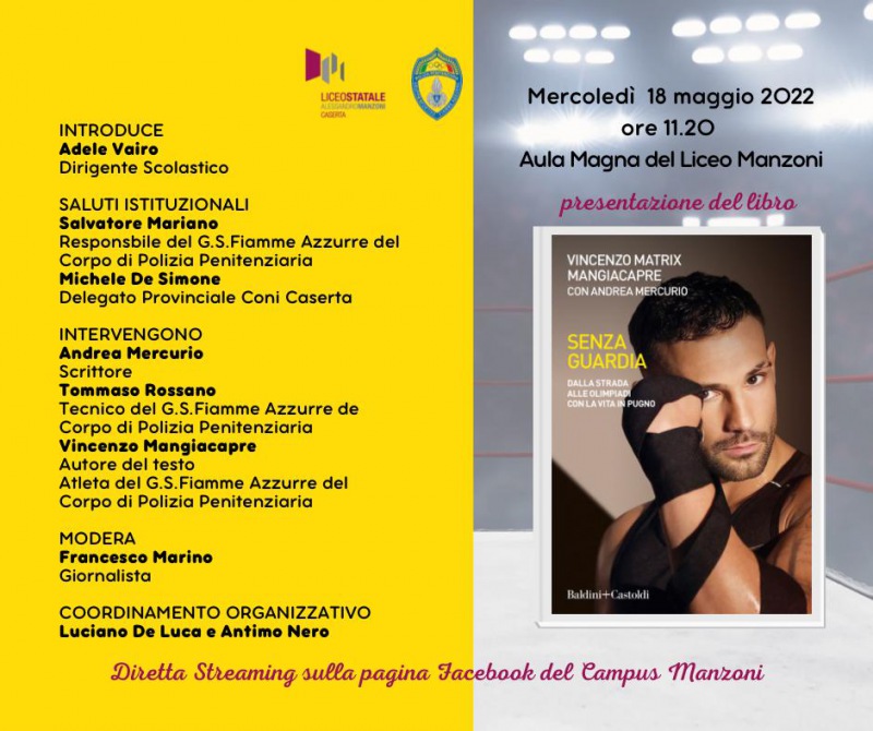 Questo il comunicato stampa diffuso dal Liceo Manzoni di Caserta: "Senza guardia, dalla strada alle Olimpiadi con la vita in pugno’: Vincenzo Mangiacapre ha scelto il liceo Manzoni di Caserta per la presentazione del libro scritto a quattro mani con Andrea Mercurio edito da Baldini Castoldi che racconta la sua vita. L’appuntamento - si legge nel comunicato - è per mercoledì a partire dalle 11,30 presso l’aula magna del liceo e in diretta Facebook sulla pagina Campus Manzoni. Mangiacapre, conosciuto da tutti come Matrix, marcianisano doc, ha una lunga carriera di successi alle spalle nella quale, tra gli altri ha conquistato un bronzo europeo, un bronzo mondiale e, soprattutto, un bronzo olimpico. «Un’altra eccellenza sceglie la nostra scuola - si legge ancora - per lanciare il suo progetto – ha spiegato la dirigente scolastica Adele Vairo – Mangiacapre è un campione nello sport e nella vita. I nostri ragazzi avranno l’opportunità di confrontarsi con un atleta che, grazie al talento e alla dedizione è riuscito a tagliare prestigiosissimi traguardi. Presenze come quelle di Mangiacapre che si sommano a quelle di altri campioni che hanno fatto visita alla nostra scuola - prosegue il comunicato - accanto ai diversi protocolli d’intesa testimoniano come lo sport sia centrale nel nostro mood formativo». Di primissimo livello il parterre che discuterà con i ragazzi del libro. Assieme alla dirigente scolastica Adele Vairo e ai due autori, infatti ci saranno il delegato provinciale del Coni Michele De Simone, il commissario capo della polizia penitenziaria del gruppo Fiamme Azzurre Salvatore Marino, il tecnico delle Fiamme Azzurre Tommaso Rossano. Il coordinamento organizzativo - si legge ancora - è affidato a Luciano De Luca e Antimo Nero. A moderare i lavori il direttore di CasertaFocus Francesco Marino".