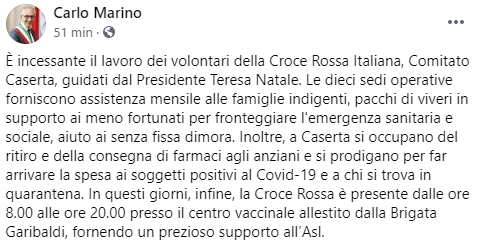 Questo il post pubblicato sulla sua pagina Facebook dal Sindaco di Caserta Carlo Marino: "È incessante il lavoro dei volontari della Croce Rossa Italiana, Comitato Caserta, guidati dal Presidente Teresa Natale. Le dieci sedi operative - si legge nel post - forniscono assistenza mensile alle famiglie indigenti, pacchi di viveri in supporto ai meno fortunati per fronteggiare l'emergenza sanitaria e sociale, aiuto ai senza fissa dimora. Inoltre, a Caserta si occupano del ritiro e della consegna di farmaci agli anziani e si prodigano per far arrivare la spesa ai soggetti positivi al Covid-19 e a chi si trova in quarantena. In questi giorni - prosegue il sindaco . infine, la Croce Rossa è presente dalle ore 8.00 alle ore 20.00 presso il centro vaccinale allestito dalla Brigata Garibaldi, fornendo un prezioso supporto all’Asl.
