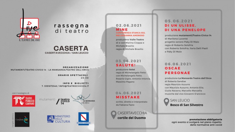 Questo il comunicato stampa diffuso da 'Mutamenti/Teatro Civico 14': "Anche a Caserta si ritorna in scena all’aperto con la rassegna di teatro «LIVE!Il teatro è dal vivo». Dal 2 al 6 giugno 2021, tra Casertavecchia e San Leucio, arriva la rassegna con cinque spettacoli organizzati da Mutamenti/Teatro Civico 14 e La Mansarda Teatro dell’Orco. L’iniziativa - si legge nel comunicato - sostenuta dal Teatro Pubblico Campano, ha lo scopo di far rinascere lo spettacolo dal vivo e far rifiorire il rapporto tra gli artisti e il pubblico. Si inizia all’interno del cortile del Duomo di Casertavecchia. Mercoledì 2 giugno alle 20,30 la compagnia Vulìe Teatroandrà in scena con lo spettacolo Mine - conferenza stanca sul melodramma amoroso di - si legge ancora - Marina Cioppa e Michele Brasilio,regia di Michele Brasilio,con Marina Cioppa e Michele Brasilio. Giovedì 3 giugno alle ore 20,30 sarà la volta di Solot, compagnia stabile di Benevento, con Salute!Regia di Michelangelo Fetto, con Michelangelo Fetto, Rosario Giglio, Antonio Intorcia, Massimo Pagano. Venerdì 4 giugno alle ore 20,30 Fabiana Fazio in MisStake,scritto, diretto e interpretato da Fabiana Fazio. Nel week end - prosegue il comunicato - «LIVE!Il teatro è dal vivo» si sposta a San Leucionell’Oasi del Bosco di San Silvestro. Sabato 5 giugno Mutamenti/Teatro Civico 14va in scena con Di un Ulisse, di una Penelopedi Marilena Lucente,progetto sonoro Paky Di Maio,regia di Roberto Solofria,con Roberto Solofria e Ilaria Delli Paoli, e con Paky Di Maio. Domenica - prosegue ancora il post - 6 giugno, La Mansarda Teatro dell’Orco proporrà Oscae Personae, Secondo studio - prosegue il comunicato - per un’ipotesi di messa in scena contemporanea della Fabula Atellanadi Roberta Sandias,regia Maurizio Azzurro,scene Francesco Felaco,maschereGiancarlo Santelli,con Maurizio Azzurro, Antonio Elia, Giulia Navarra, Marcello Manzella, musiche Giovanni D’Ancicco. In collaborazione con il Centro Studi sulla Tradizione della Maschera Teatrale in Campania. Costo del Biglietto €5,00 Ingresso pubblico ore 20.00 / orario spettacoli 20:30 (...) PRENOTAZIONE OBBLIGATORIA e i posti sono limitati – Ogni evento si svolgerà nel pieno rispetto della normativa sanitaria per il contenimento della diffusione del contagio da Covid-19, con l’obiettivo di garantire la salute e la sicurezza - si legge ancora nella nota - sia degli operatori che degli utenti. Il progetto LIVE – Il teatro è dal vivovedequindici tra teatri e compagnie indipendenti che si associano per creare una vetrina, una vera e propria mostra sul teatro contemporaneo campano, per ricucire quei fili spezzati col proprio pubblico - prosegue il comunicato - a causa della pandemia. Lo scopo è far rifiorire, rinascere, alimentare e riportare in vita quegli spettacoli che stavano per debuttare, che erano in prova, che più di una volta hanno visto annullate le proprie repliche. Sono stati scelti quattro luoghi diversi che fossero alternativi ma complementari alle sale teatrali: il Museo ferroviario di Pietrarsa - si legge ancora - la Basilica di San Gennaro presso le catacombe di Napoli, il Mulino Pacifico di Benevento, Casertavecchia e San Leucio a Caserta. Si tratta di luoghi che incidono su un territorio prossimo a quello dove le stesse compagnie agiscono abitualmente e che in più si distinguono per essere siti di grande valore estetico e culturale. Il desiderio - prosegue il comunicato - è creare una sinergia virtuosa, per cui il pubblico, affezionato a una singola piazza, possa essere incuriosito e spinto a vivere l’esperienza teatrale in tutti i luoghi della rassegna. L’organizzazione dell’evento è affidata al nuovo Teatro Sanità e al NEST di Napoli, al Teatro Civico 14 insieme a La Mansarda Teatro dell’Orco di Caserta e alla Compagnia Solot di Benevento. L’iniziativa - prosegue il comunicato - è realizzata con il sostegno del Teatro Pubblico Campano. La rassegna si inserisce quest’anno nella programmazione del progetto “La Campania è Teatro, Danza e Musica”, promosso da ARTEC/ Sistema MED in collaborazione - si legge ancora - con SCABEC - Società Campana Beni Culturali e Fondazione Campania dei Festival. CALENDARIO CASERTAVECCHIA – cortile del Duomo 2 giugno – Vulìe Teatro Mine - conferenza stanca sul melodramma amoroso di Marina Cioppa e Michele Brasilio regia di Michele Brasilio con Marina Cioppa e Michele Brasilio. Durante la trasmissione Mine il presentatore Gabriele Rossi, insieme con la dottoressa Benedetta Vizzicari - si legge nel comunicato - e con supporto di contributi video, dimostrerà come e perché il rapporto di coppia sia un melodramma inutile. Obiettivo della trasmissione televisiva è l’abbandono del bigottismo a favore di una maggiore apertura mentale, perché non c’è bisogno di fare tante storie per farsi una storia. Durante la serata si interpreteranno - prosegue il comunicato - i conflitti psichici che nascono quando si è in coppia e come senza amore la coppia può esistere con individualità e unicità, che sono i soli valori fondamentali per l’essere umano: fermarsi prima di dirsi “ti amo” significa preservare la propria vita. Vulìe Teatro presenta il suo ultimo lavoro, uno spettacolo comico, cinico e paradossale. Proprio come l’amore. 3 giugno – Solot compagnia stabile di Benevento Salute! regia di Michelangelo Fetto con Michelangelo Fetto, Rosario Giglio, Antonio Intorcia, Massimo Pagano. L’Italia è una Paese - si legge nel comunicato - dallo straordinario patrimonio di vitigni autoctoni e nello stesso tempo è il Paese dell’arte, della musica, del teatro, della poesia. Lo spettacolo “Salute!” non fa altro che unire le “forze”, le peculiarità vincenti di questo meraviglioso Paese, attraverso una performance divertente, poetica, coinvolgente, prodotta dalla Solotcompagnia stabile di Benevento, che mette in scena quattro attori che reciteranno, suoneranno, canteranno e balleranno il Vino. 4 giug