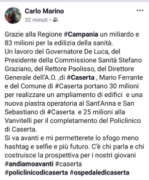 Questo il post pubblicato sulla pagina fb del Sindaco di Caserta Carlo Marino.