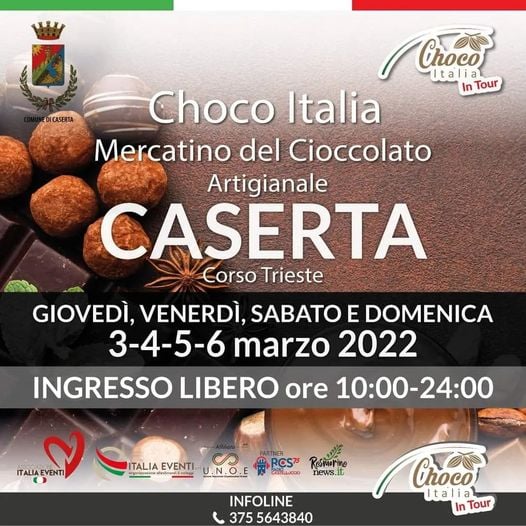 Ha preso il via ieri a Caserta Choco Italia in Tour, il Festival del Cioccolato Artigianale. Per tutto il weekend, fino a domenica 6 marzo dalle 10,00 fino a mezzanotte, nel primo tratto di corso Trieste - si legge nel post - a pochi passi dalla Reggia, gli stand degli espositori con specialità in cioccolato e dolcezze da gustare per grandi e piccini".