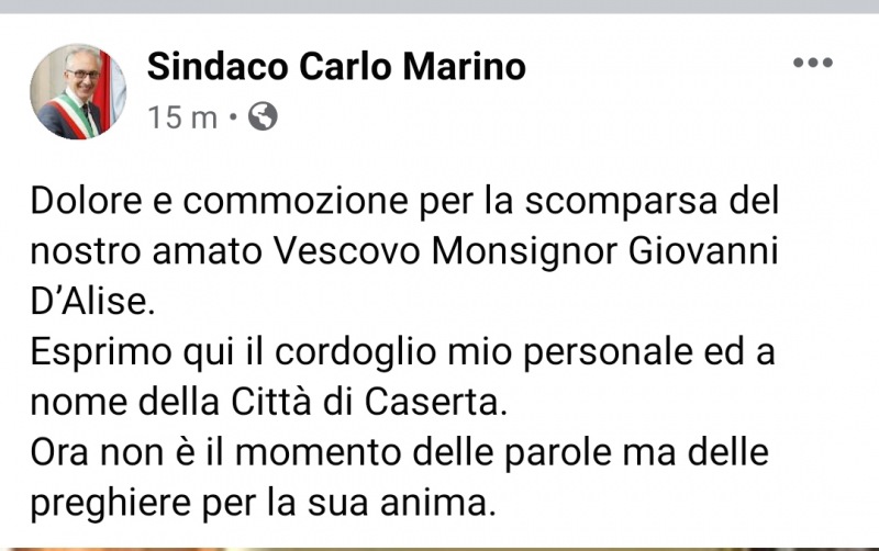 Mons. Giovanni D'Alise è venuto a mancare. Era risultato positivo al covid-19 ed era stato ricoverato all'ospedale Sant'Anna e San Sebastiano di Caserta. Stamane la notizia della sua scomparsa è trapelata e si è diffusa tra i fedeli. A confermarla, anche il Sindaco di Caserta Carlo Marino attraverso la sua pagina Facebook. Mons. D'Alise, settantaduenne, era Vescovo di Caserta da sei anni. Le più sentite condoglianze a familiari e conoscenti anche d parte della nostra redazione.