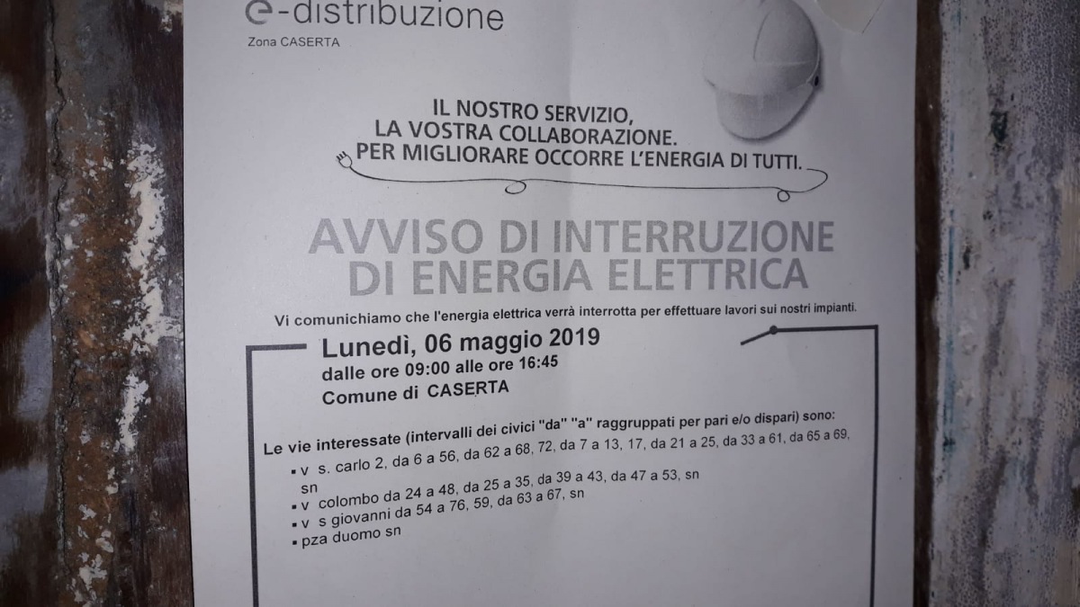 Ecco l'avviso di interruzione di energia elettrica in centro a Caserta.