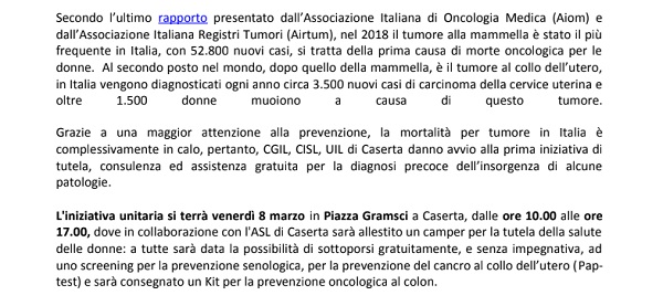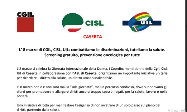 CASERTA. L'8 marzo di CGIL, CISL, UIL: combattiamo le discriminazioni, tuteliamo la salute