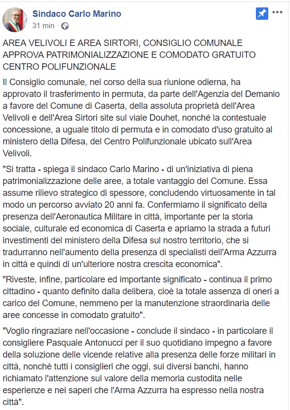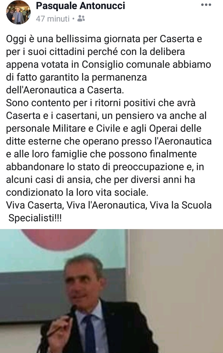 Il Sindaco di Caserta Carlo Marino ed il consigliere comunale Pasquale Antonucci hanno fatto sapere attraverso i propri profili Fb che il Consiglio comunale di Caserta ha approvato la delibera che garantisce la permanenza dell'Aeronautica in città. Un pensiero particolare ai dipendenti ed alle loro famglie che erano in agitazione.