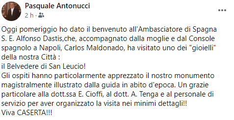 Questo il post pubblicato sulla sua pagina Facebook dal Vicesindaco di Caserta Pasquale Antonucci: "Oggi pomeriggio ho dato il benvenuto all'Ambasciatore di Spagna S. E. Alfonso Dastis,che, accompagnato dalla moglie e dal Console spagnolo a Napoli, Carlos Maldonado, ha visitato uno dei "gioielli" della nostra Città: il Belvedere di San Leucio! Gli ospiti - si legge nel post - hanno particolarmente apprezzato il nostro monumento magistralmente illustrato dalla guida in abito d'epoca. Un grazie particolare alla dott.ssa E. Cioffi, al dott. A. Tenga e al personale di servizio per aver organizzato la visita nei minimi dettagli!! Viva CASERTA!!!".