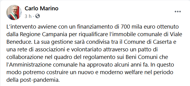 Questo il post pubblicato sulla pagina Facebook del sindaco di Caserta, Carlo Marino: "L’intervento avviene con un finanziamento di 700 mila euro ottenuto dalla Regione Campania per riqualificare l’immobile comunale di Viale Beneduce. La sua gestione - si legge nel post - sarà condivisa tra il Comune di Caserta e una rete di associazioni e volontariato attraverso un patto di collaborazione nel quadro del regolamento sui Beni Comuni che l’Amministrazione comunale ha approvato alcuni anni fa. In questo modo - conclude - potremo costruire un nuovo e moderno welfare nel periodo della post-pandemia".
