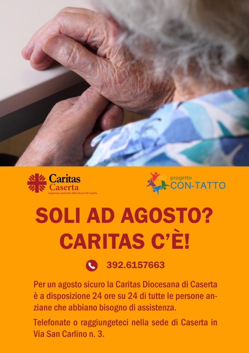 Nel mese di agosto la Caritas diocesana di Caserta sarà a disposizione 24 ore su 24 di tutte le persone anziane che hanno bisogno di assistenza. Chiunque si trovi in difficoltà può telefonare o recarsi alla sede in via San Carlino n.3.