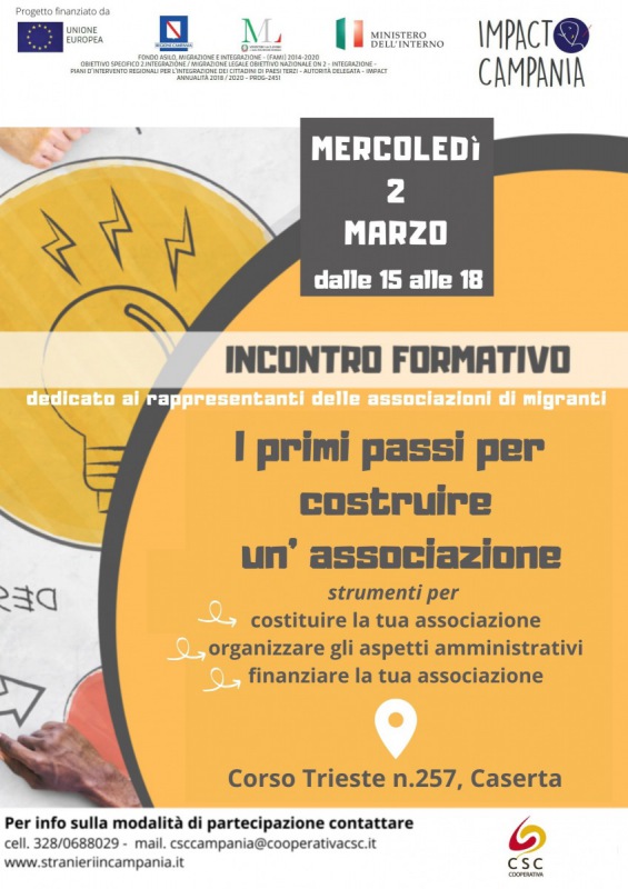 Questo parte del comunicato stampa diffuso dalla cooperativa sociale 'CSC - Credito senza confini': "La cooperativa sociale ‘CSC - Credito senza confini’ al fianco delle associazioni dei migranti. Quelle già avviate e quelle in via di costituzione. Attraverso un incontro formativo gratuito che si svolgerà mercoledì 2 marzo alle ore 15 nella sede di corso Trieste a Caserta. Si tratta - si legge nel comunicato - di una iniziativa realizzata nell’ambito del progetto Impact Campania, finanziato con fondi Fami (Fondo Asilo, Migrazione e Integrazione) per rafforzare le competenze interculturali di chi si occupa di immigrazione. Nel corso di questo incontro sarà infatti possibile, tra le altre cose, apprendere quali sono i primi passi da compiere - prosegue il comunicato - per costruire una realtà associativa, quali gli adempimenti burocratici, come si redige un progetto e come ci si candida ad un finanziamento. ‘L’obiettivo – spiega Hasnae Guettaya, referente di CSC - è quello di favorire l’attività di chi si occupa o intende occuparsi di immigrazione perché il loro ruolo è fondamentale per il miglioramento della situazione dei cittadini stranieri. Le associazioni fungono - si legge ancora - in effetti da ponte tra culture diverse e da collante tra gli stranieri e le istituzioni locali. Da qui l’idea di questo incontro che nasce proprio per fornire supporto, consulenza, testimonianze esperienziali e tutti quegli strumenti utili al raggiungimento dell’obiettivo. Grazie al coinvolgimento di alcuni professionisti, tra questi un avvocato e due commercialisti, verrà offerto ai partecipanti un quadro completo della vita associativa: dalla fase di start up a quella di stabilizzazione. Analizzando tutti gli aspetti - prosegue il comunicato - che contraddistinguono l’operato del terzo settore’. (...) Il progetto Impact Campania ha come soggetto capofila la Regione Campania e come partner una fitta rete di enti istituzionali e del terzo settore quali Anci Campania, Cantiere Giovani Cooperativa Sociale, CIDIS Onlus, Consorzio La Rada, Cooperativa Sociale Credito Senza Confini, Dedalus Cooperativa Sociale, Less Cooperativa sociale - conclude il comunicato - LTM – Gruppo Laici Terzo Mondo, Tertium Millennium Società Società Cooperativa Sociale, Traparentesi Onlus".