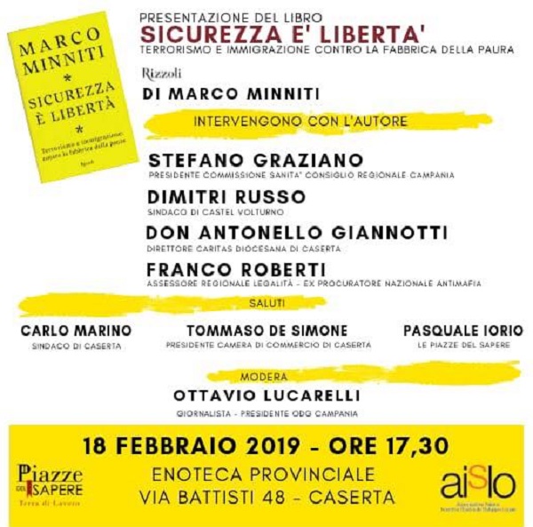 Sarà presentato lunedì 18 Febbraio alle ore 17.30 presso l'Enoteca Provinciale in via C.Battisti a Caserta il libro di Marco Minniti 'Sicurezza e libertà'.