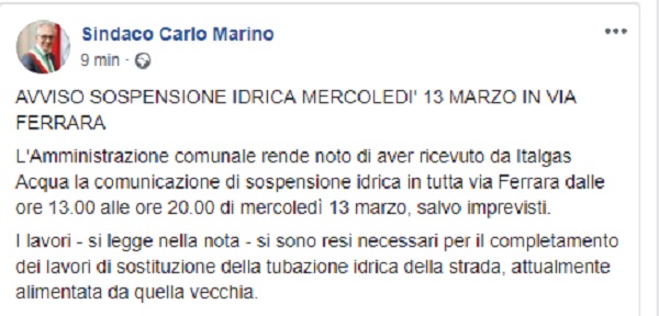 Questo il post pubblicato sulla pagina fb ufficiale del Sindaco di Caserta Carlo Marino.