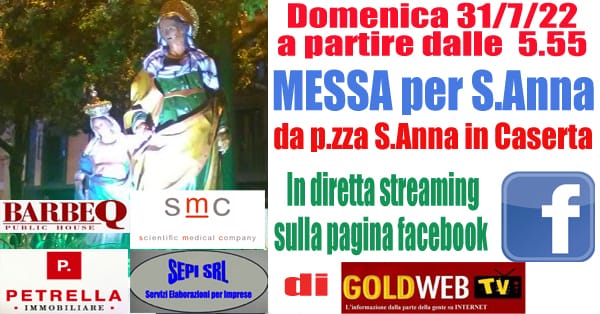 Domenica la tradizionale messa del mattino per celebrare la copatrona di Caserta Sant'Anna, poi la processione per le strade della città. GoldwebTv trasmetterà in diretta streaming a partire dalle 5.55 sulla sua pagina Facebook, la celebrazione ed i primi momenti della tradizionale processione. Si ringraziano gli sponsor Barbeq, Sepi Srl, Smc (Scientific Medical Company) ed Immobiliare Petrella.