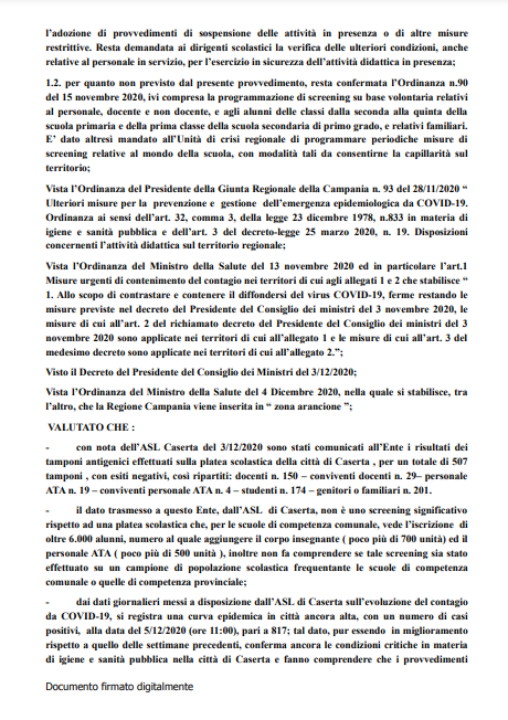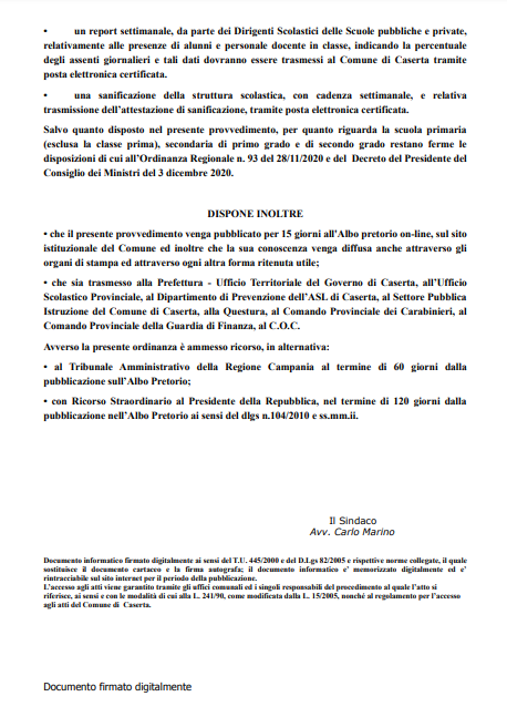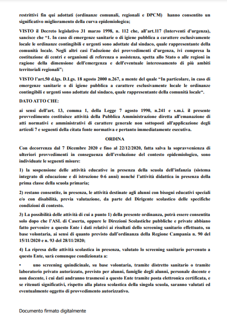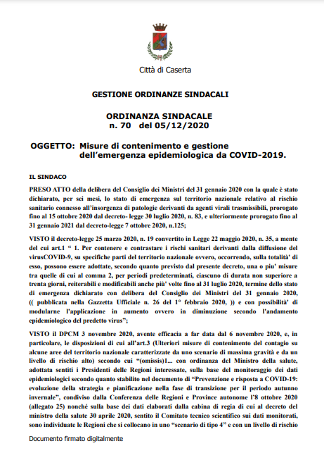 Di seguito, il testo dell'Ordinanza Sindacale del Comune di Caserta, giunta in redazione.