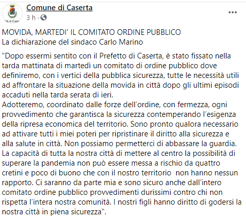 Questo il post pubblicato sulla pagina Facebook 'Comune di Caserta': "MOVIDA, MARTEDI' IL COMITATO ORDINE PUBBLICO