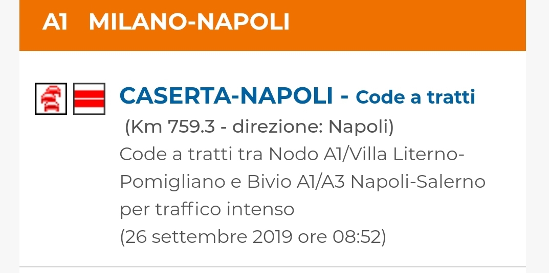 Code a tratti tra Nodo A1/Villa Literno-Pomigliano e Bivio A1/A3 Napoli-Salerno per traffico intenso. (26 settembre 2019 ore 08:52"